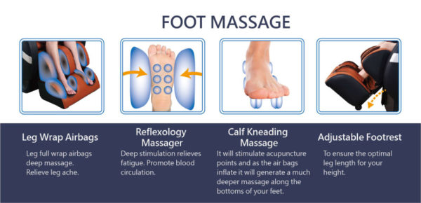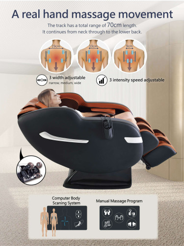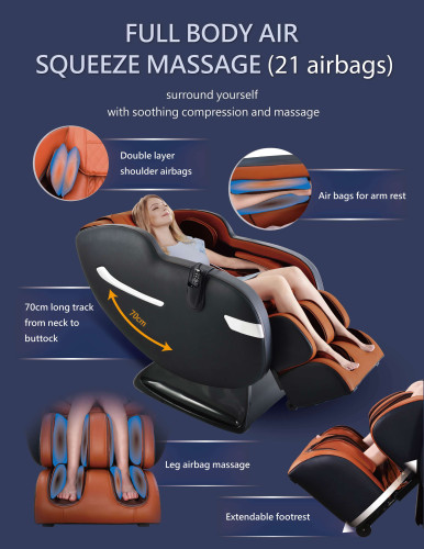 Krēsls piedāvā 4 automātiskās un 5 manuālās masāžas programmas, sildīšanas funkciju, trīs gaisa spiediena intensitātes līmeņus, nulles gravitācijas pozīciju un kāju masāžu. Augstas kvalitātes PVC ādas polsterējums nodrošina ilgmūžību un elegantu izskatu.